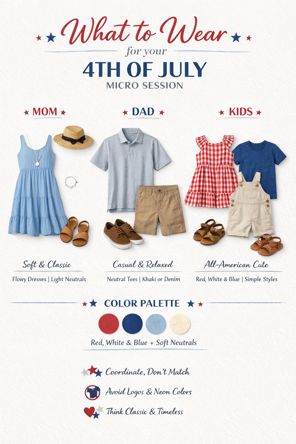 Keep it simple, comfortable, and festive! For these 4th of July micro sessions, think classic Americana with a soft, timeless feel—not overly “costumey.”